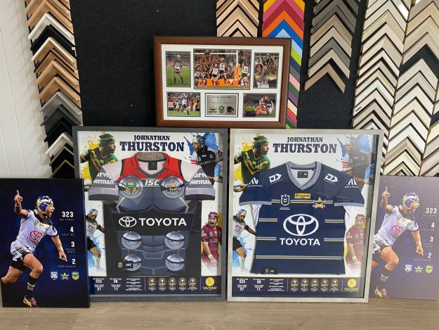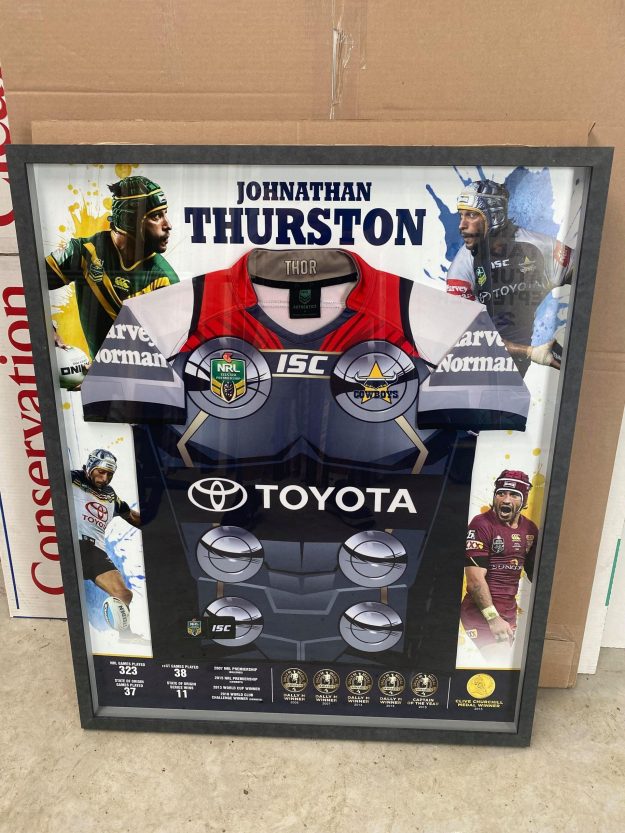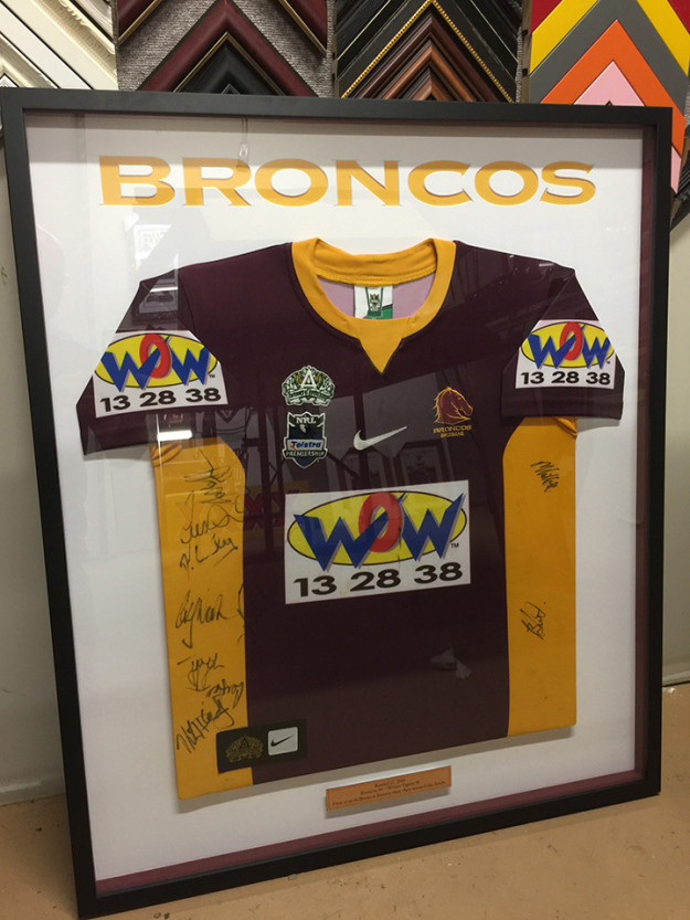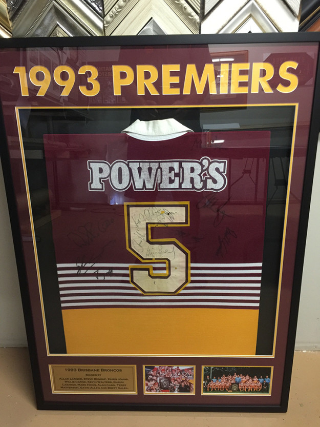 With a career in framing sports items stretching back to 1998, Ipswich Picture Framing is your number one choice for all of your framing needs. We have framed items for World, Australian and State Champions all the way down to backyard heroes. Call us to discuss your sporting memorabilia framing needs. We even have a range of signed, authentic sports items for sale in our showroom!